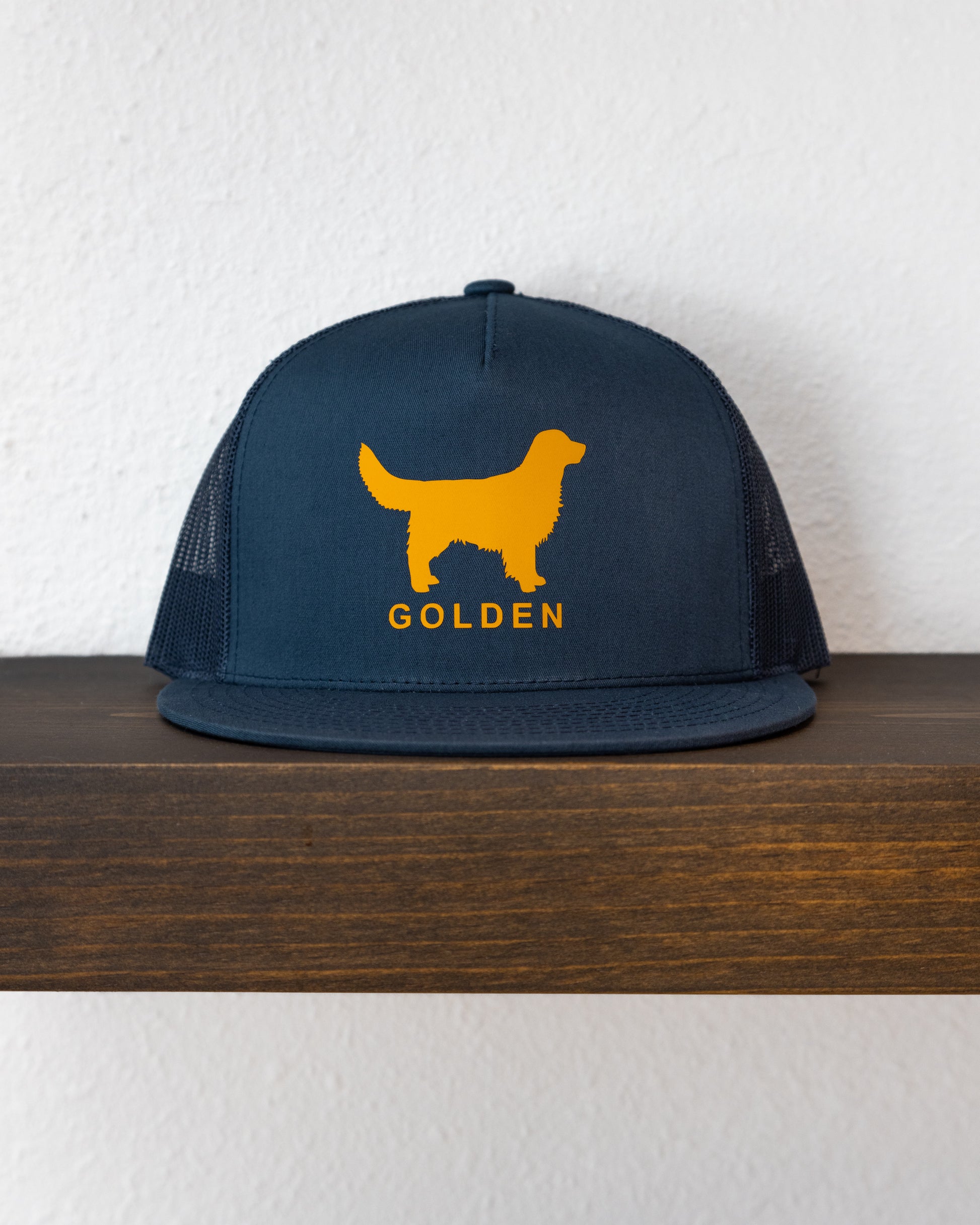 This Golden Retrievers Retro Unisex 5-Panel Flat Bill Trucker Snapback is crafted with 65% polyester & 35% cotton, and features a gold colored vinyl logo.